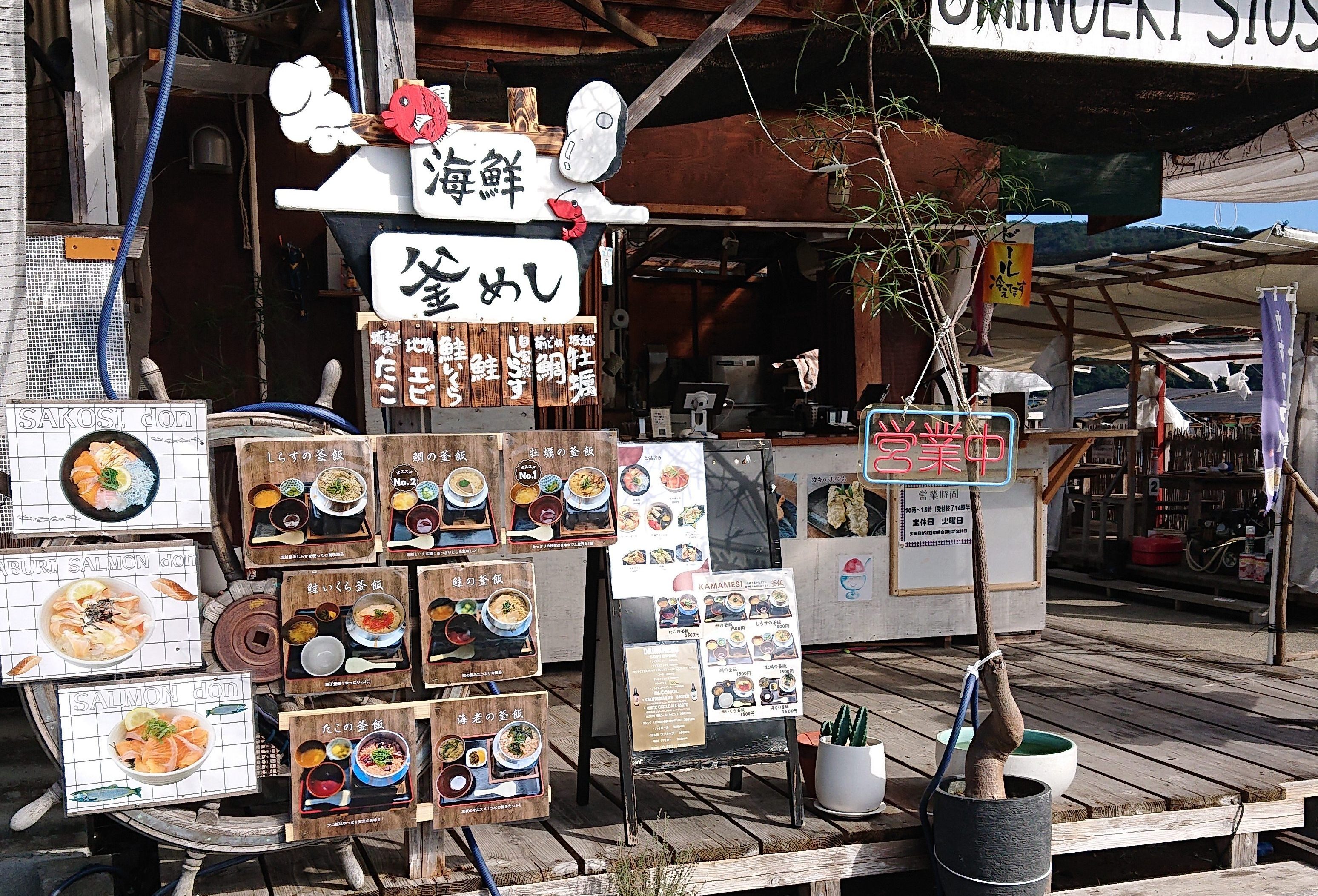 冬は坂越のカキのカキフライや蒸しかきなどをメインとし春はオイスターサーモンを使った料理や夏には生シラス丼、釜揚げしらす丼、さまざまな料理を堪能していただけます。新たに海鮮 釜めしメニューも追加しました。地魚を使った海鮮 釜めしですカフェメニューやアルコールも提供しております